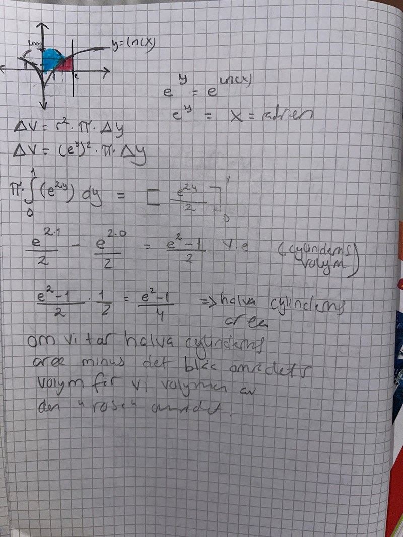 Okej. Alltså sammanfattningsvis ska man förstå att man ska ta cylinderns rotationsvolym minus funktionen f(x)=ln(x) rotationsvolym kring y axeln. Detta ger oss V2. Vilket är volymen på hålet