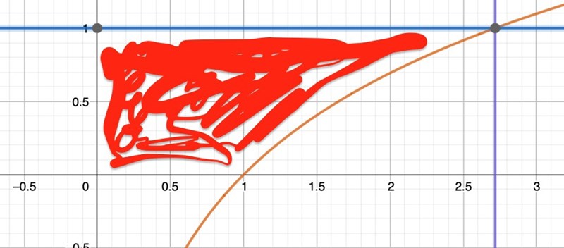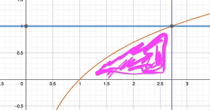 alltså är integrationsgränsen x=0 och x=e . Men hur ska man tänka sen? Vilken area är det de vill att jag ska räkna? Jag förstår inte vad jag ska göra