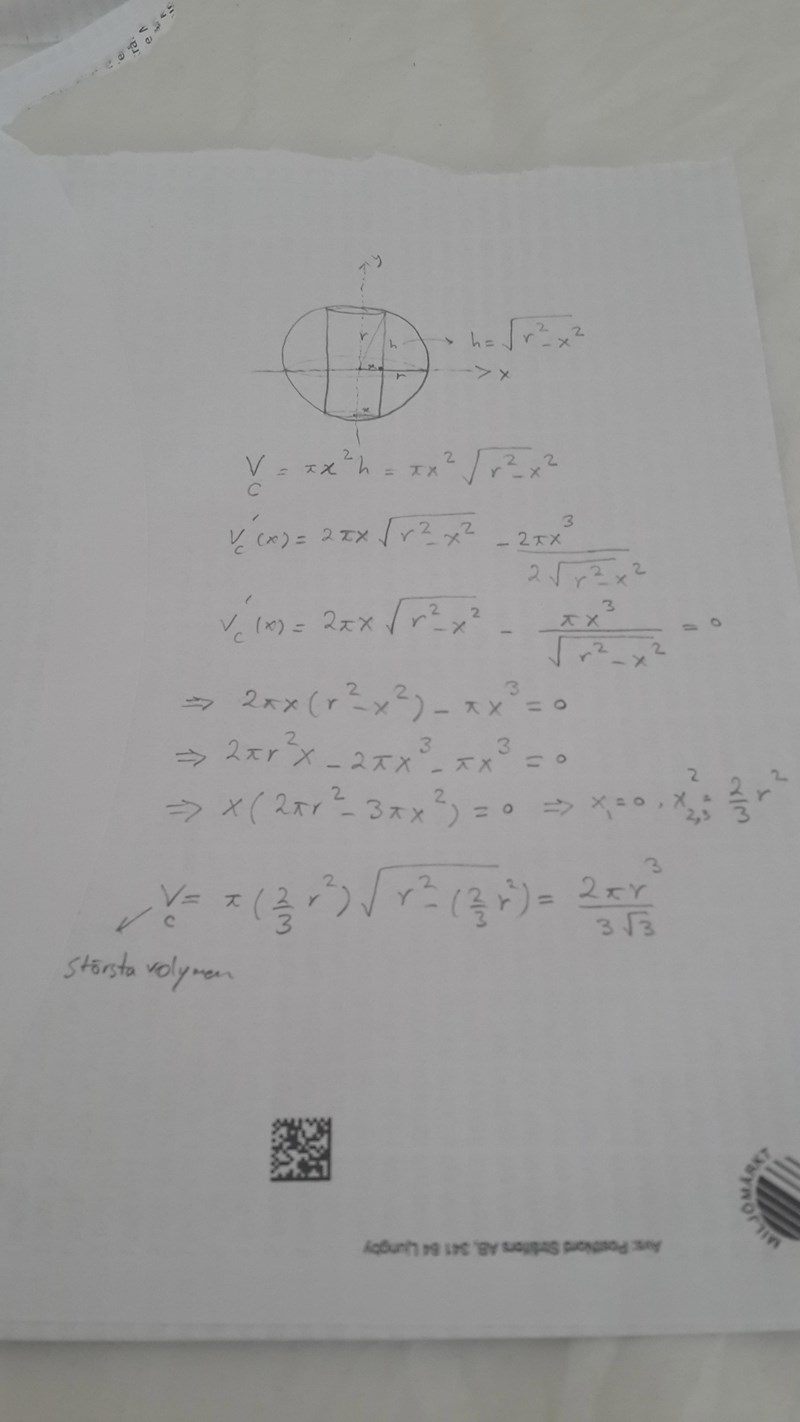 Uppgift: Bestäm volymen av den största räta cirkulära cylinder, som kan inskrivas i en sfär med radien R.