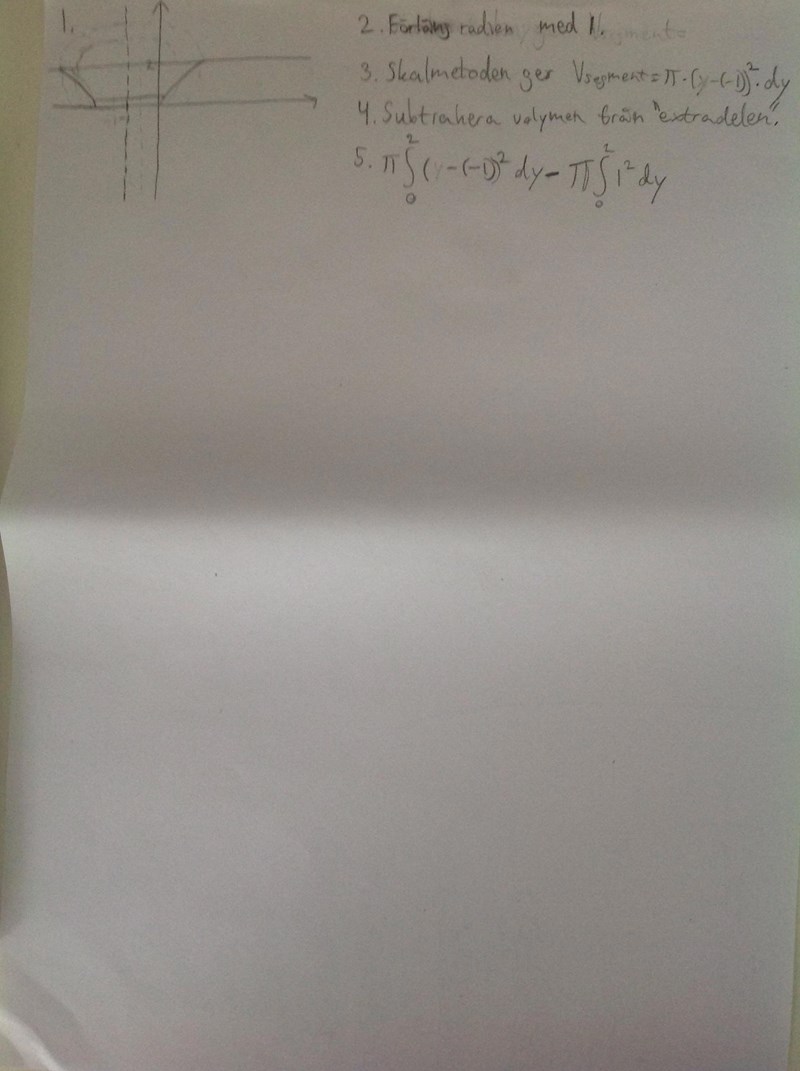 4. Nu har jag tagit fram ett uttryck för volymen av den solida rotationskroppen. Men den har ju ett cylinderformat hål i mitten. Det måste jag dra bort. Cylindern har radien 1 och höjden 2 och alltså volymen pi*1^2*2.