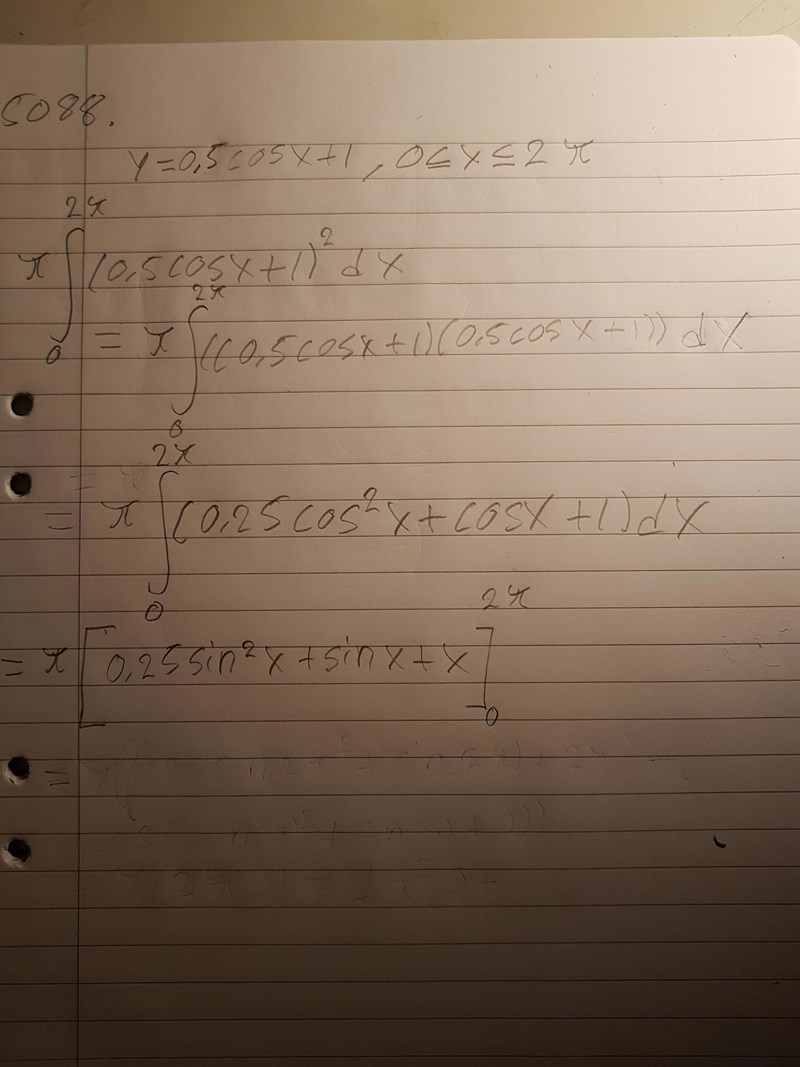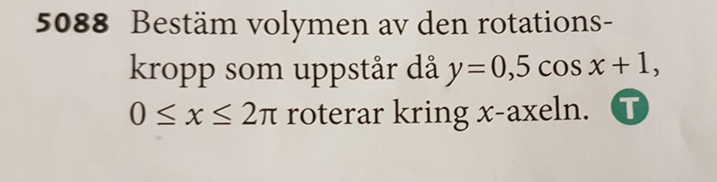 Bestäm volymen av rotationskroppen y = 0,5 cos x + 1 i ett givet intervall