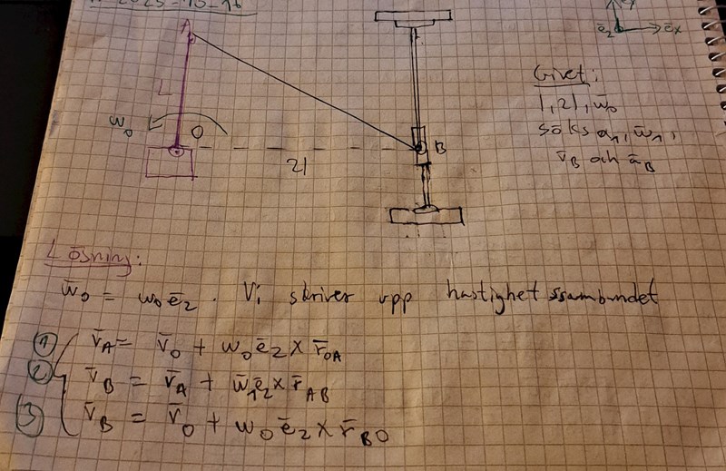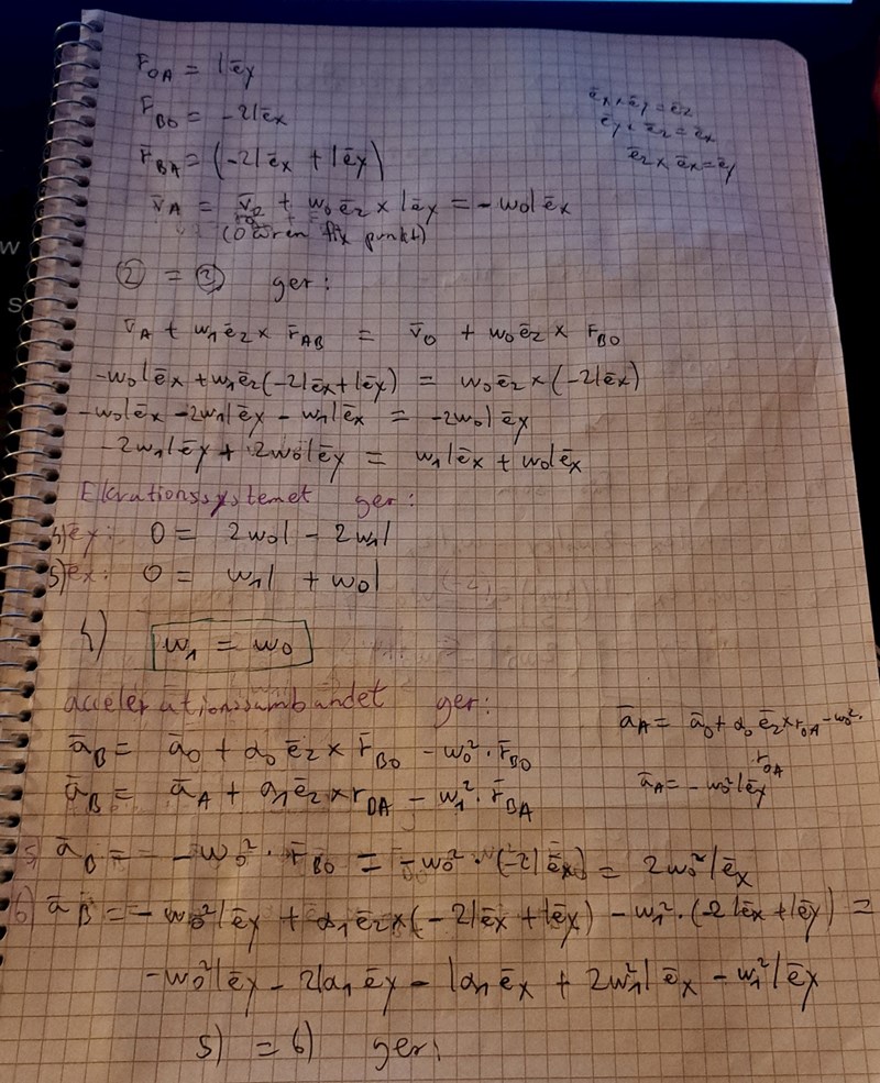 Jag fick dessvärre fel svar på alfa1, vb och a_b och jag vet inte vad som gick snett med mitt svar samt lösning. Det enda felet jag kan se är när jag bestämmer r_AB. Jag undrar om det är relevant att beräkna v_b map på O som referenspunkt och samma för a_b för uppgiften talar bara om OA och AB.