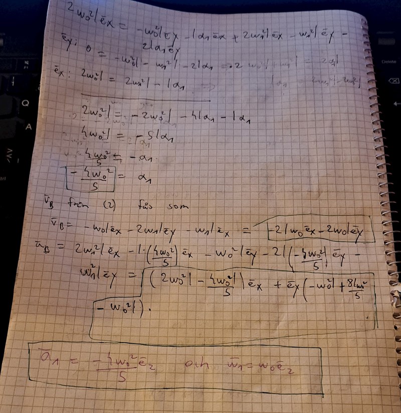 PATENTERAMERA skrev:Tänk på att kolven B glider längs en vertikal skena. Du har därför villkoren att (vB)x = 0 och (aB)x = 0. Utnyttja det i dina beräkningar för att få fram w1, alfa1 osv.