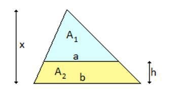 I triangeln är a parallell med b. Arean A1=10cm^2 och A2=80cm^2, och a+b=20cm. Bestäm x.