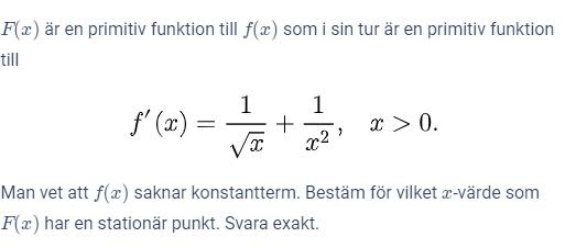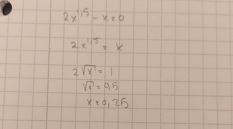 Svaret ska då bli lösningen på denna (2x^0.5)-(x^-1)=0