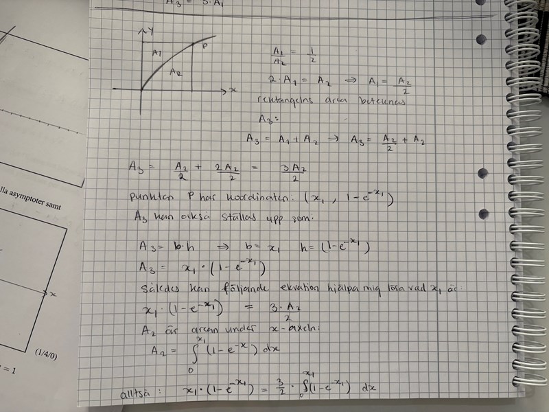 Ojj, jag menade mellan grafen och x-axeln. Tack, jag ska lösa ekvationen.