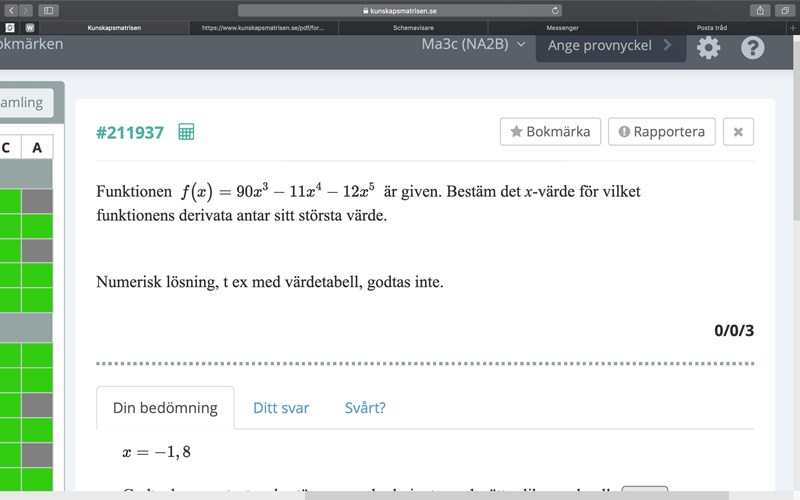 Bestäm x-värde för vilket funktionens derivata antar sitt största värde