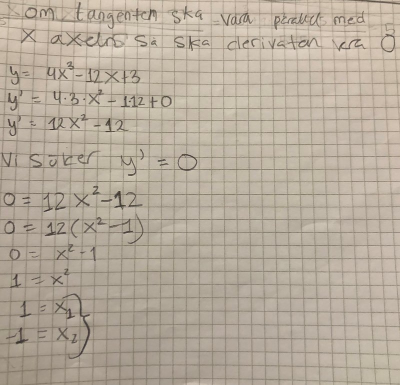 För vilka värden på x är tangenterna till kurvan y=4x3−12x+3 parallella med x-axeln ?