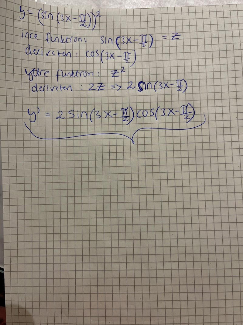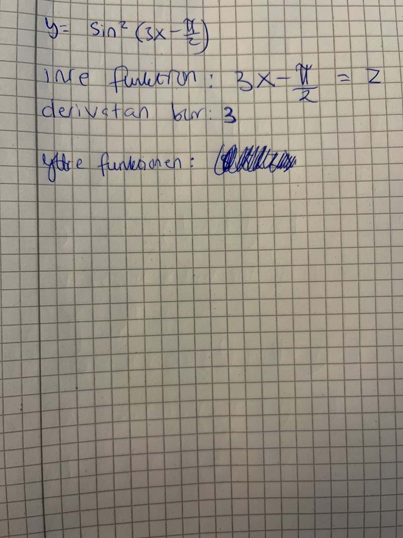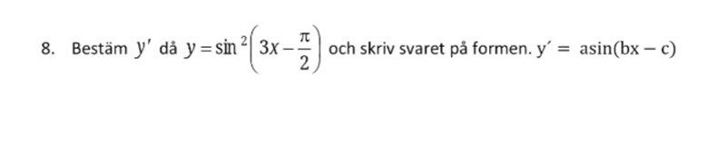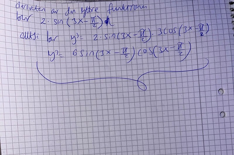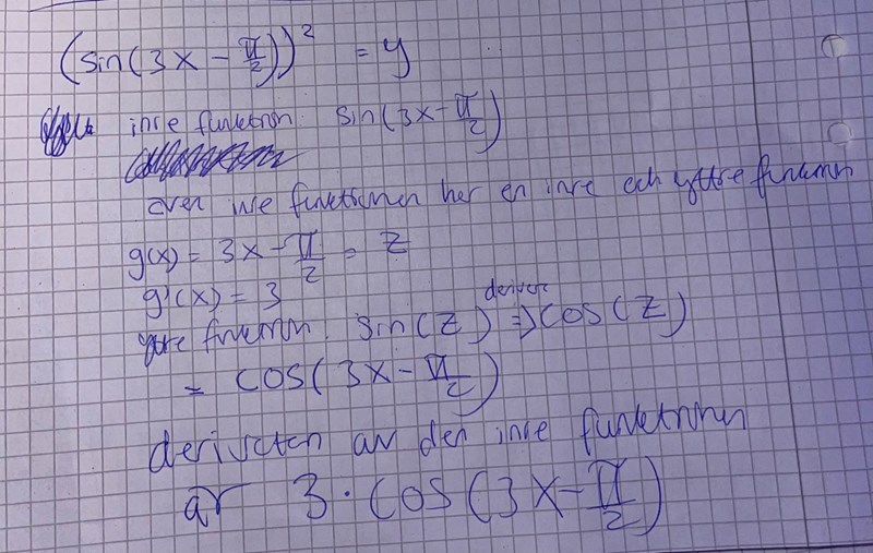 2. Är du med på att derivatan av sin2(3x-pi/2) är lika med 2•sin(3x-pi/2) multiplicerat med derivatan av sin(3x-pi/2)?