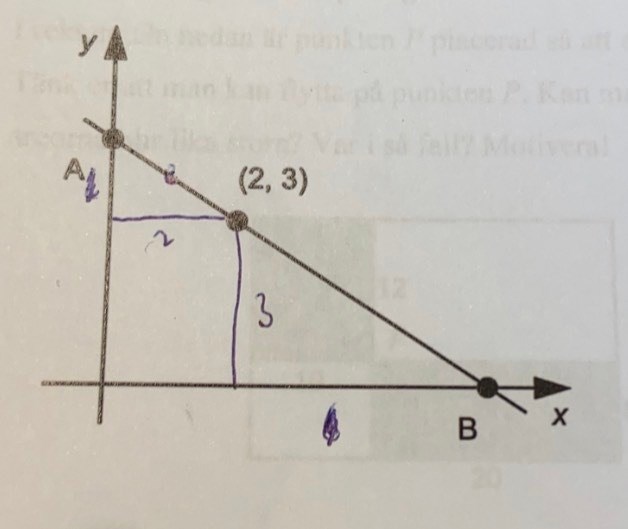 Linjen går igenom punkten (2;3). Punkten B har en x-koordinat som är tre gånger så stor som y-koordinaten i A. Bestäm y-koordinaten för punkten A exakt.