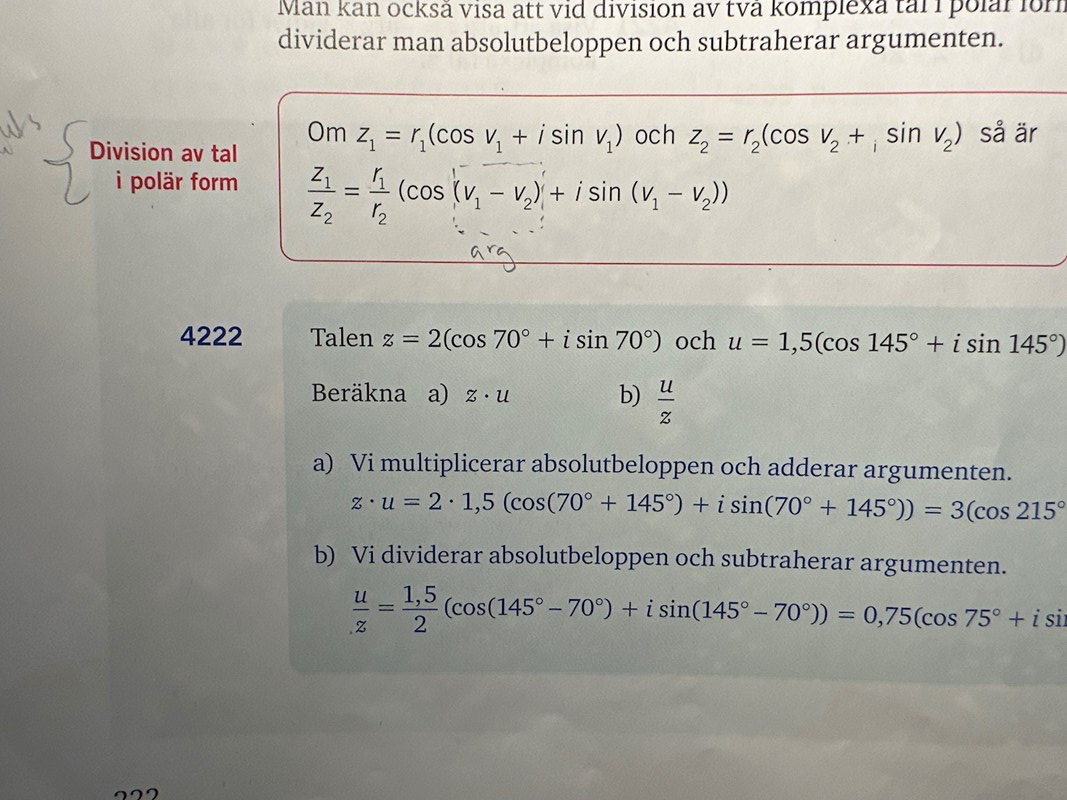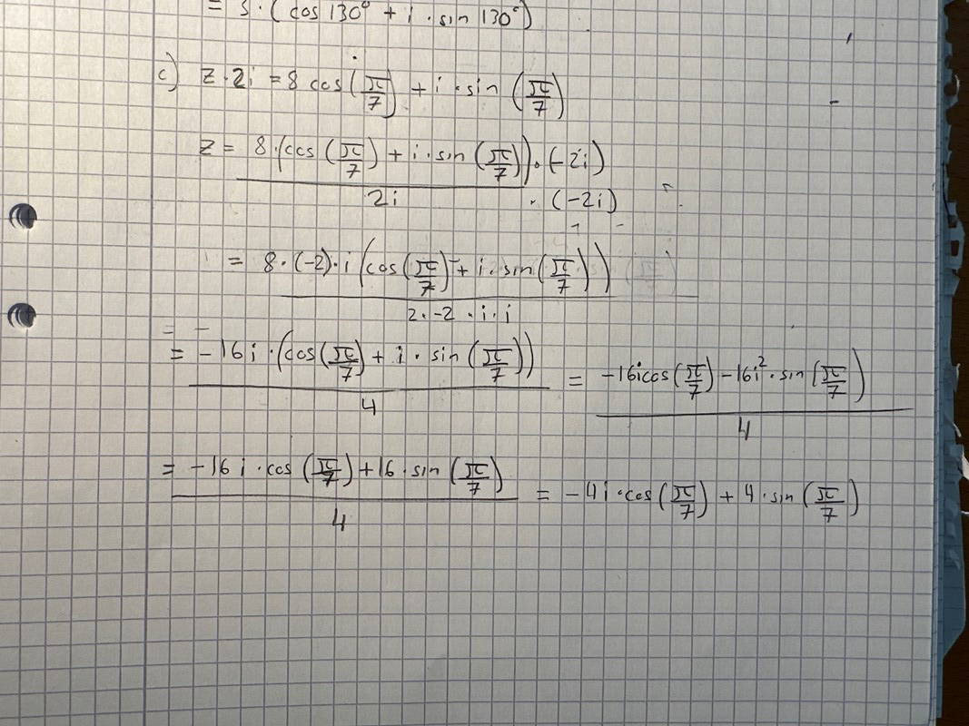 Du kan förlänga med komplexkonjugatet till 2i, men det är enklare att istället skriva nämnaren 2i som ett komplext tal på (trigonometrisk) polär form r(cos(v)+i*sin(v)) och sedan använda räknereglerna som på de tidigare uppgifterna.