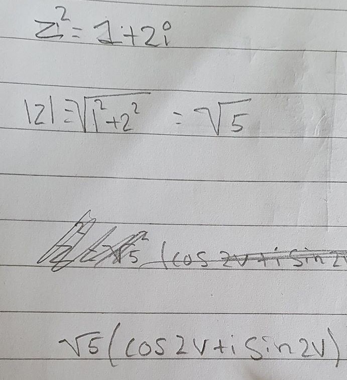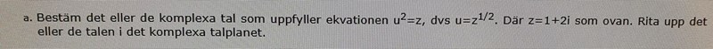 Man får u^2 (de Moivre's)= r^2(cos2v+isin2v)=sqrt(5)(cos63+isin63) om du identifierar termerna på båda sidor får du din vinkel. Kan du fortsätta