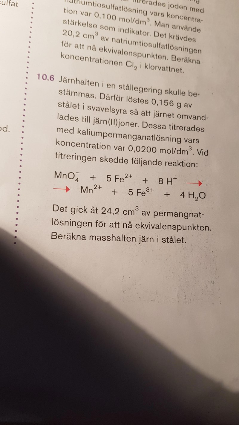 - Beräkna hur många mol permanganatjoner som har tillsatts.