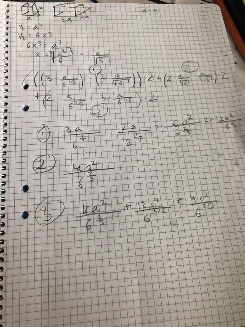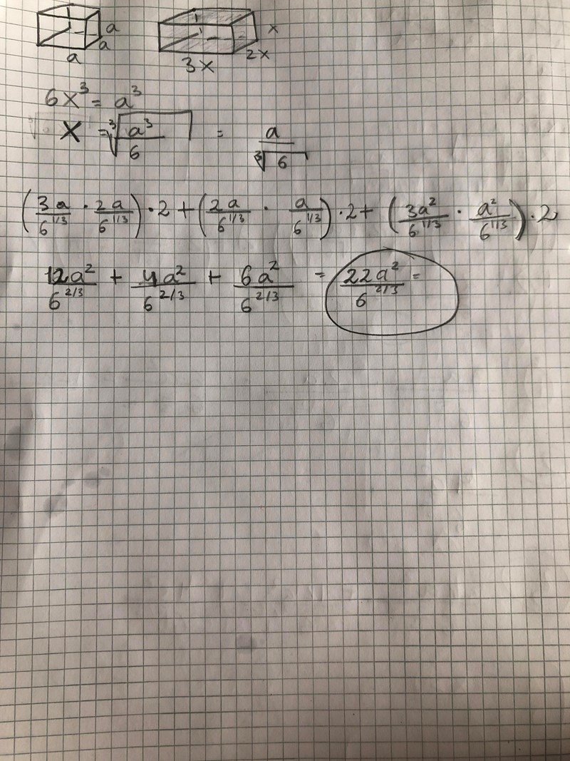 Sätt volymerna lika, beräkna därefter x uttryckt i a och blockets totala begränsningsyta uttryckt i a.