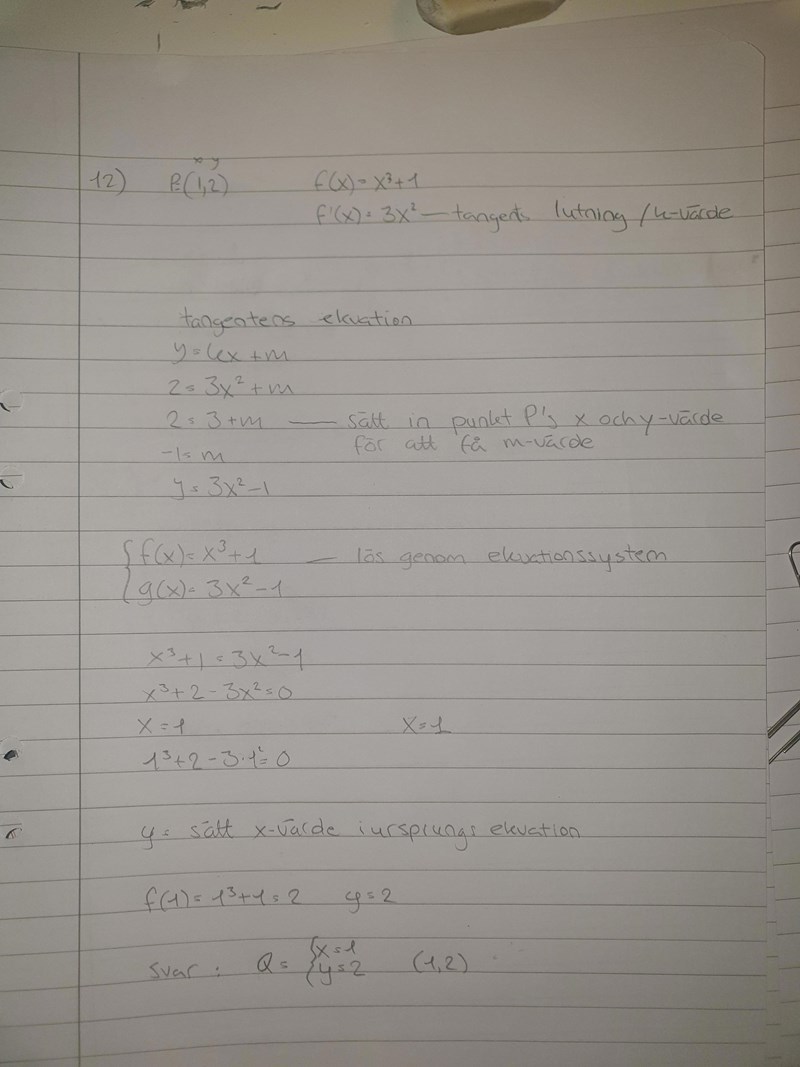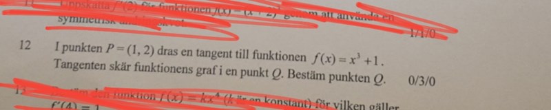jag ska lösa den här uppgiften algebraliskt. Jag har försökt genom att derivera funktionen f(x)=x^3+1 som då blir f'(x)=3x^2 och sen genom additionsmetoden och balansmetoden lösa det och kolla skärningspunkten på det sättet men det blir inte rätt. Vi vet punkten P=(1, 2)
