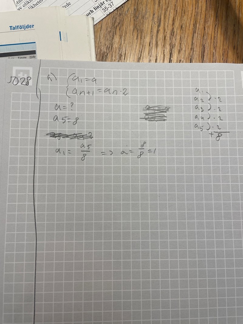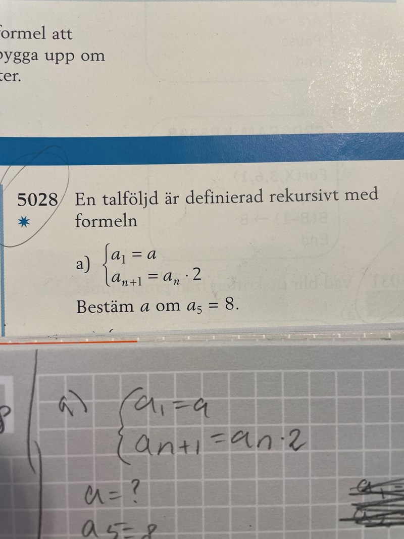 Ja precis det är uppgiften på bilden jag gör! Men jag blev lite förvirrad när den andra personen skrev 3… men så man ska gångar med två för varje nytt an+1? För isåfall förstår jag ej då blir de ju att man ska dela med åtta och det blir fel…