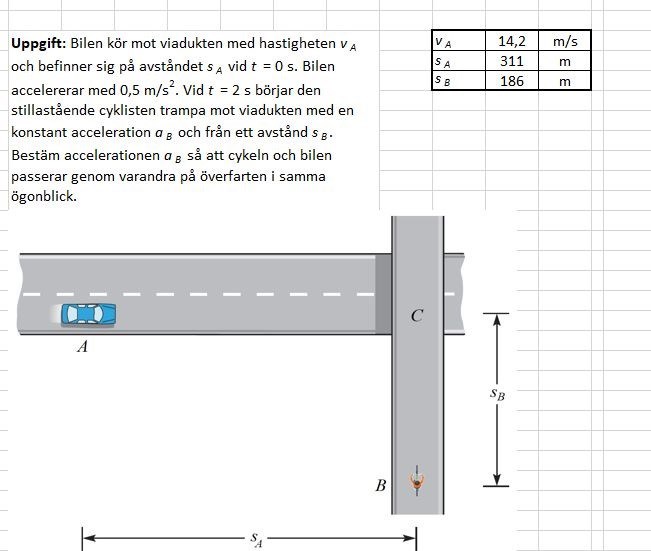 Eftersom cykeln startar vid t=2 s bör cykeln ta sig till punkten C på 16,88-2=14,88 s om den ska korsa C samtidigt som bilen?. Tänker jag rätt nu??