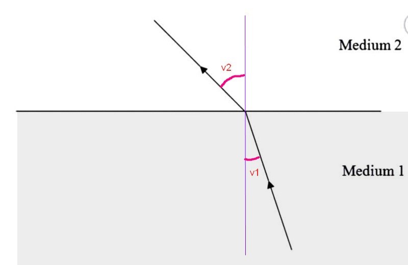 Precis som du själv ritade så räknar man infallsvinkel och brytningsvinkel mot normalen. Jag har kallat de vinklarna för v1 och v2.