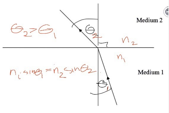 Det betyder att sidan med högre brytningsindex har en mindre vinkel (då sin(v) är en växande funktion mellan 0° och 90°).