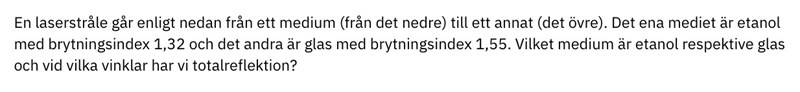 Vi vet att brytningsindex för etanol är 1,32, och för glas är den 1,55. Men jag vet inte hur man avgör vilken medium som är etanol respektive glas. Jag vet också att vi behöver använda brytningslagen i denna uppgift. Kan någon ge mig tips på hur man ska tänka här? Vi vet ingenting om vilka vinklar dessa har. Jag tror att optisk täthet är en relevant term här, då om ljus bryts mot normalen så säger man att det ena mediumet är optisk tätare än det andra.