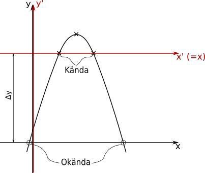 Jag tycker att det låter som att du tänker rätt. Du ser att 2 av de givna punkterna har samma y-koordinat. Du skapar en nytt koordinatsystem () där -axeln ligger på den höjden. x-koordinaterna är samma som -koordinaterna men -koordinaterna är förskjutna. I det nya koordinatsystemet har kurvan en enkel faktorform. Sen behöver du bara "lyfta" kurvan (med i figuren) så du ekvationen för den ursprungliga funktionen.