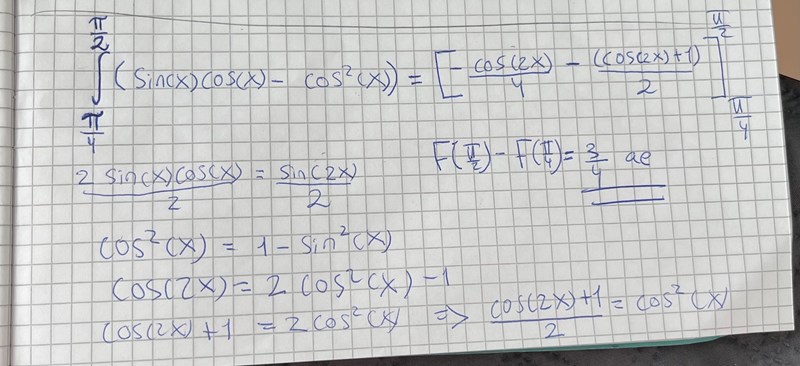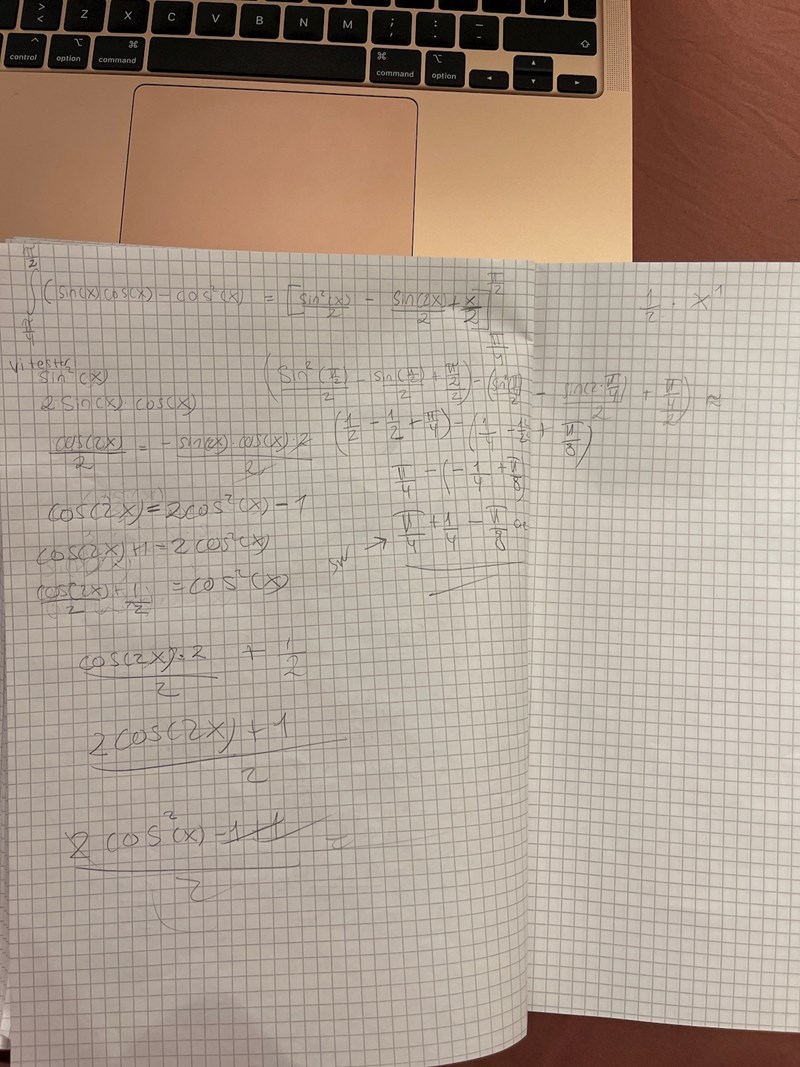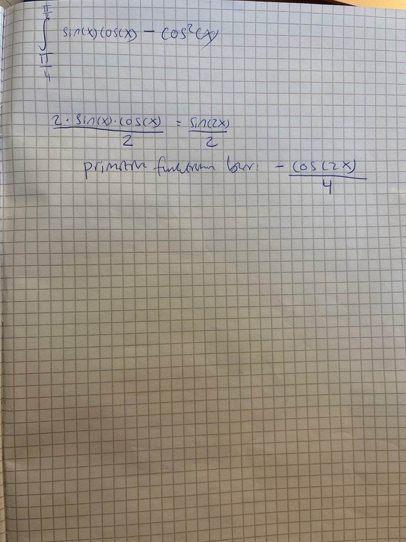 jag gjorde som du skrev . Jag skrev om sin(x)*cos(x) till 2sin(x)cos(x)/2 =sin(2x)/2 vilket jag sedan tar fram den primitiva funktionen av