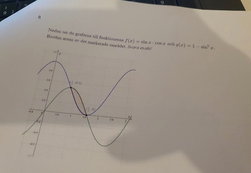 Bestäm arean mellan graferna till funktionen f(x)=sin(x)*cos(x) och g(x)=1-sin2(x) .