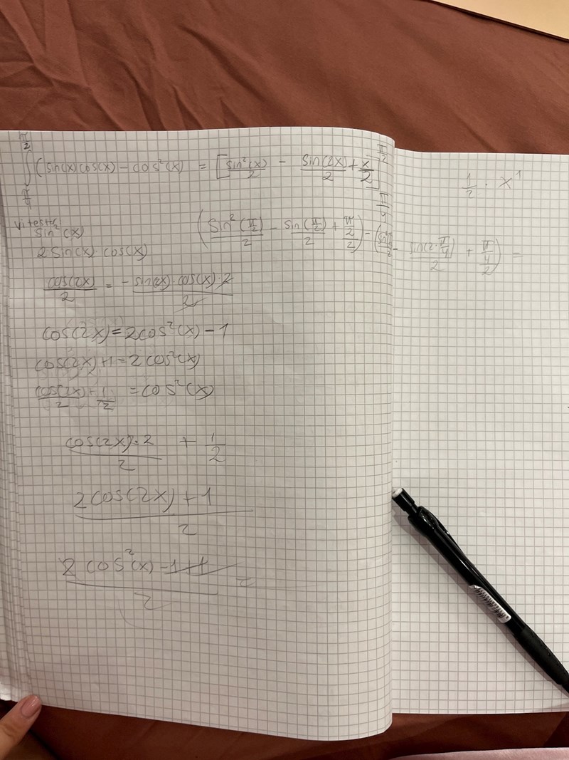 Katarina149 skrev:Hur får jag fram den primitiva funktionen av sin(x)cos(x)-cos2(x)?