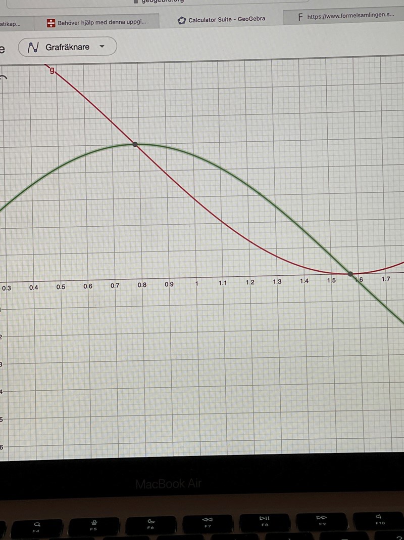Hej! Jag har försökt att först räkna ut den exakta skärningspunkten algebraiskt men jag får enbart den ena skärnings punkten. Hur får jag den andra skärningspunkten? Jag vill hitta integrationsgränsena algebraiskt