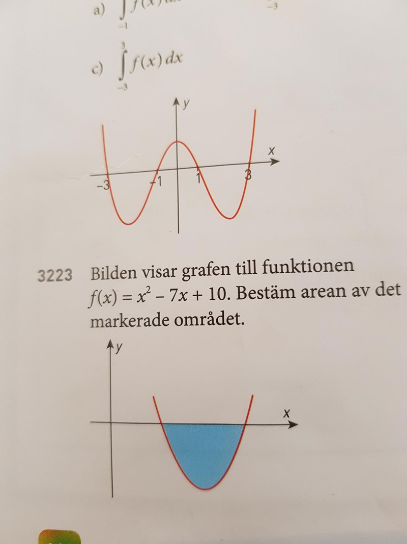 till f(x)=x^2-7x+10 , sätta in gränserna x1 och x2 och räkna ut ytan av det blå området.