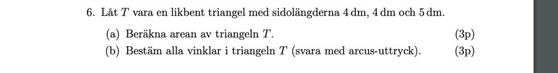 Bestämma arean och vinklarnas respektive vinkelgrader för en likbent triangeln.