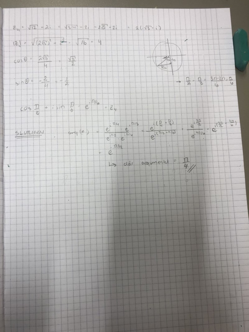 Beloppen påverkar inte argumentet, så det räcker att titta på de ingående talens argument, hitta dessa och lägga ihop. Kom sen ihåg att argumentet för en produkt är summan av de ingående argumenten: , och motsvarande för division (då subtraherar man argumenten istället). Du kan alltså ställa upp: