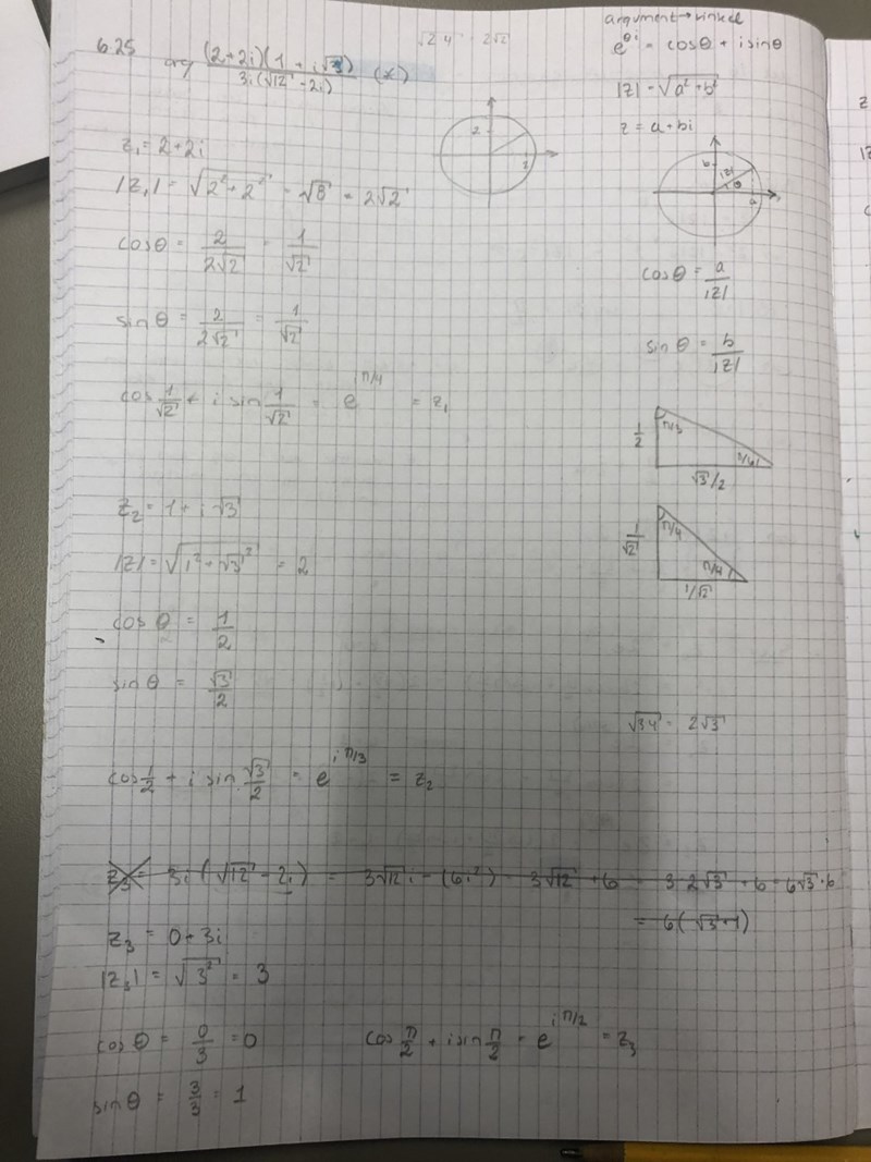 Real- och imaginärdel kan du sedan använda för att hitta vinklarnas tangensvärden, och sen hitta argumentet med arctan (alla vinklarna är dock standardvinklar, så det går att känna igen tangensvärdena och skippa miniräknare). T.ex. för den andra termen: .