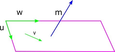 Du vill hitta en vektor m så att den inte helt ligger i planet som spänns av u och w.