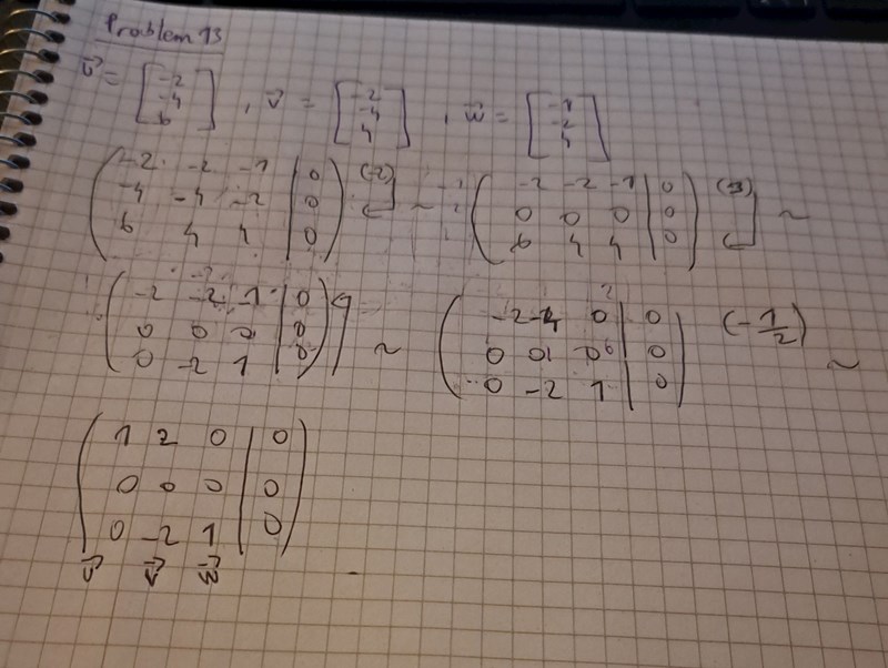 Jag undrar hur man ska göra på vardera frågorna? Jag är osäker på om jag gjort rätt här för jag gausade och kom fram till att u och w måste vara linjärt oberoende. Men hur bestämmer jag sen en vektor som är en bas för rummet?