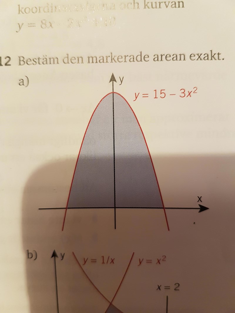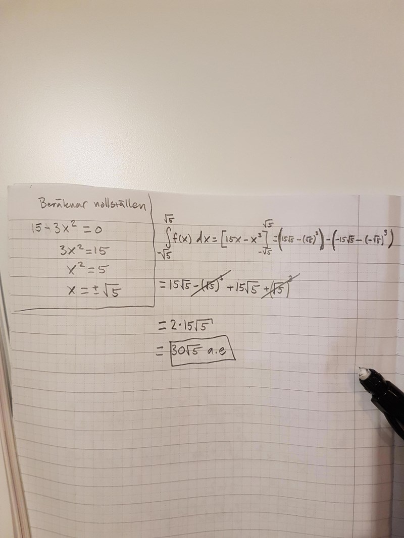 Du kan även tänka att funktionen är symmetrisk kring y-axeln så det räcker att beräkna halva arean, dvs integrera från till .