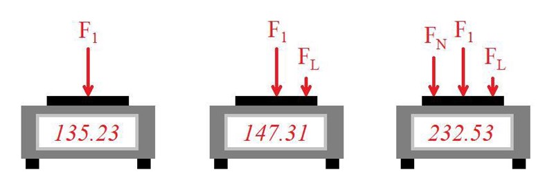 Trots min gigantiska tabbe tidigare så kan jag försöka. Om vi bara tittar på vågen så får vi följande krafter för de tre vägningarna: