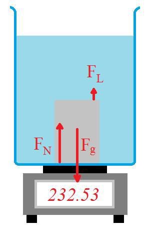 Figur 2. Vågen registrerar en kraft som motsvarar tyngdkraften på m1 plus lyftkraften FL som vattnet påverkar metallstycket. Dvs vågen visar m1 + FL/g.