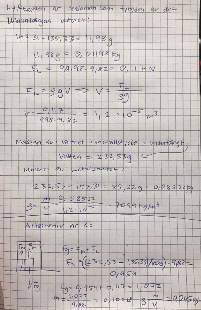 I alternativ 1 gör du fel på massan av metellstycket, ska vara cirka 232=135. Dvs den högra avläsningen minus den vänstra.