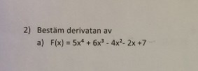 F(x) är en polynomfunktion. Derivata av "7" (konstant) är NOLL, derivata av "2*x" (linjär funktion) är 2, det återstår att derivera 3 potensfunktioner. Använd additionsregeln & linjäriteten.