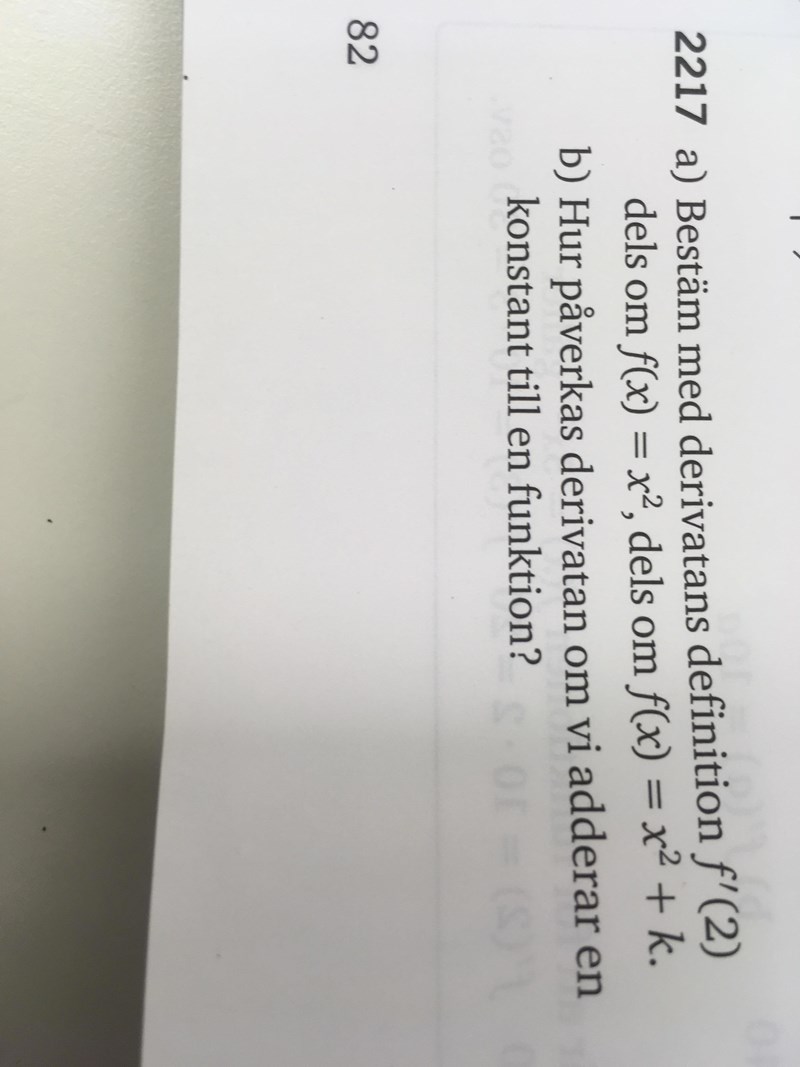 På denna uppgift så har jag redan löst det första problemet när jag ska bestämma derivatans definition när f(x)=x^2. Men sedan vill de att man ska bestämma derivatans definition när f(x)=x^2+k och jag förstår verkligen inte hur man ska gå tillväga, för om jag anänder samma metod så vet jag inte vad jag ska göra med konstanten? Kan någon snälla hjälpa mig?