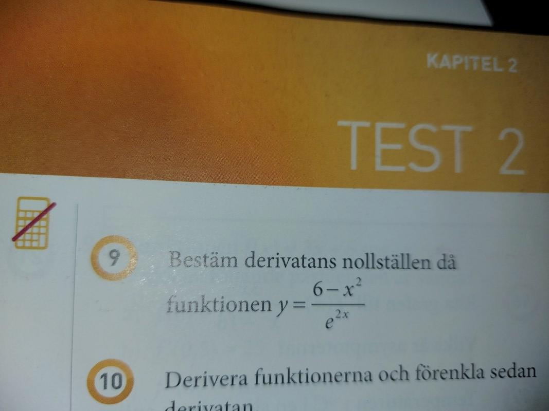 Hej, förstår inte riktigt hur de kommer fram till svaret: x=3 eller x= -2. Jag börjar med att derivera och får efter förkortning, sen flyttar jag upp e^2x och sätter =0 för att sedan använda nollproduktsmetoden för att få nollställena. --> . Man får inte använda miniräknare, hur ska jag lösa det?