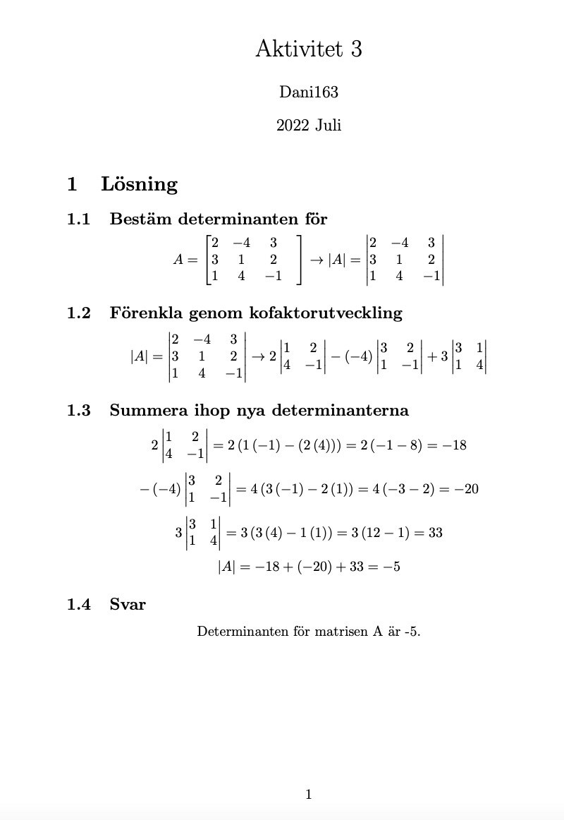 2. Kunde väl förtydliga med en mening att du kofaktorutvecklar uter första raden. Man kan ju välja att utveckla efter kolumner och så, så det kan du förtydliga i text.