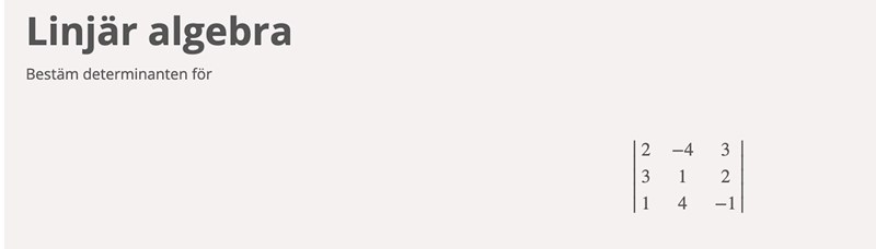 I övrigt ser det väl okej ut (även om jag inte dubbelkollar beräkningarna). Slutsvaret är rätt: https://www.wolframalpha.com/input?i=det%28%5B%5B2%2C-4%2C3%5D%2C%5B3%2C1%2C2%5D%2C+%5B1%2C4%2C-1%5D%5D%29