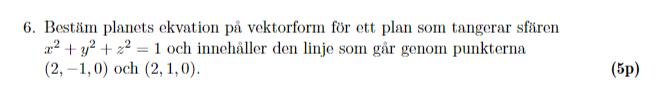 naytte skrev:D4NIEL skrev:Vill man lösa det här mer "algebraiskt" kan man tänka så här; vi har tre punkter , samt . Eftersom tangeringspunkten ligger på enhetssfären kan också betraktas som en normal till tangentplanet med längden . Det ger oss följande ekvationer