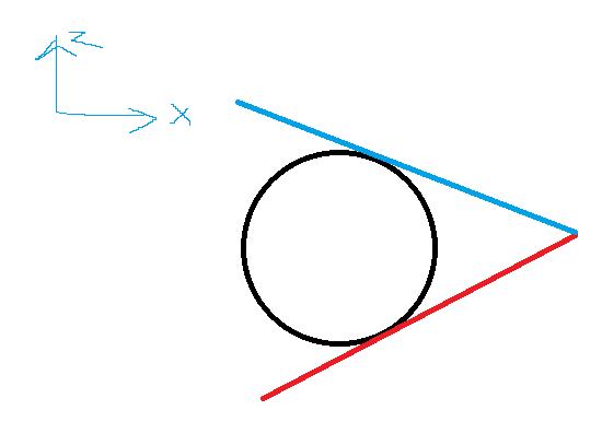 Det vi väsentligen gör med symmetriargumentet är att vi projicerar ned rummet på XY-planet för y=0 (alltså planet y=0 som jag ritade i svar #6). Nu har vi ett 2D problem och vi vill bestämma linjen som skär punkten (x,z)=(2,0) sådan att den tangerar cirkeln x2+z2=1. Vi skulle kunna säga att vi har projicerat bort y-dimensionen då denna inte har någon betydelse för svaret.