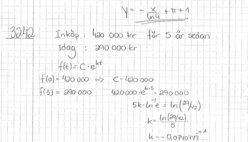 så då blir funktionen typ: f(5)=420000*e^k5=240000