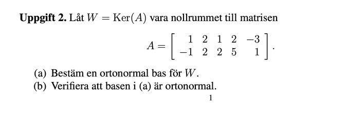 På a)-delen så utgick jag ifrån att Ker(A) är lika med spannet av A:s kolonner, och därefter använde jag mig utav Gram-Schmidts metod för att få fram den ortonormala basen. Fick fram följande resultat;