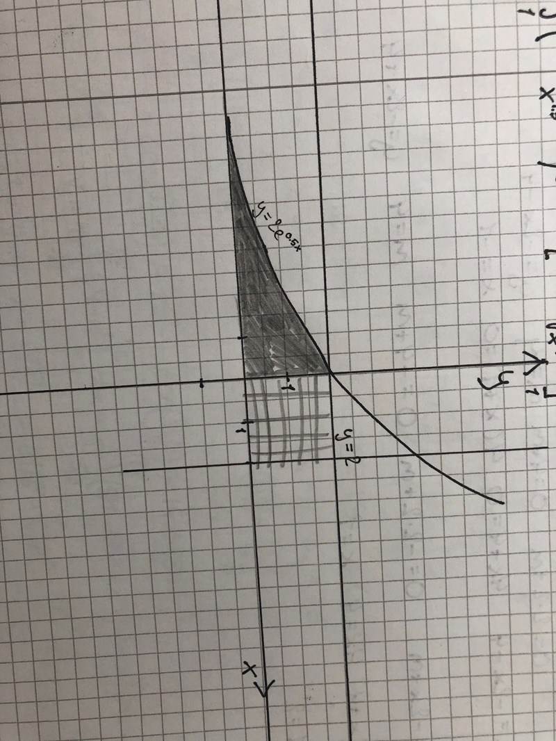 "Kurvan  y = 2e0,5x samt de räta linjerna  x = 2  och  y = 2  begränsar ett område som får rotera kring x-axeln. Bestäm rotationskroppens volym."