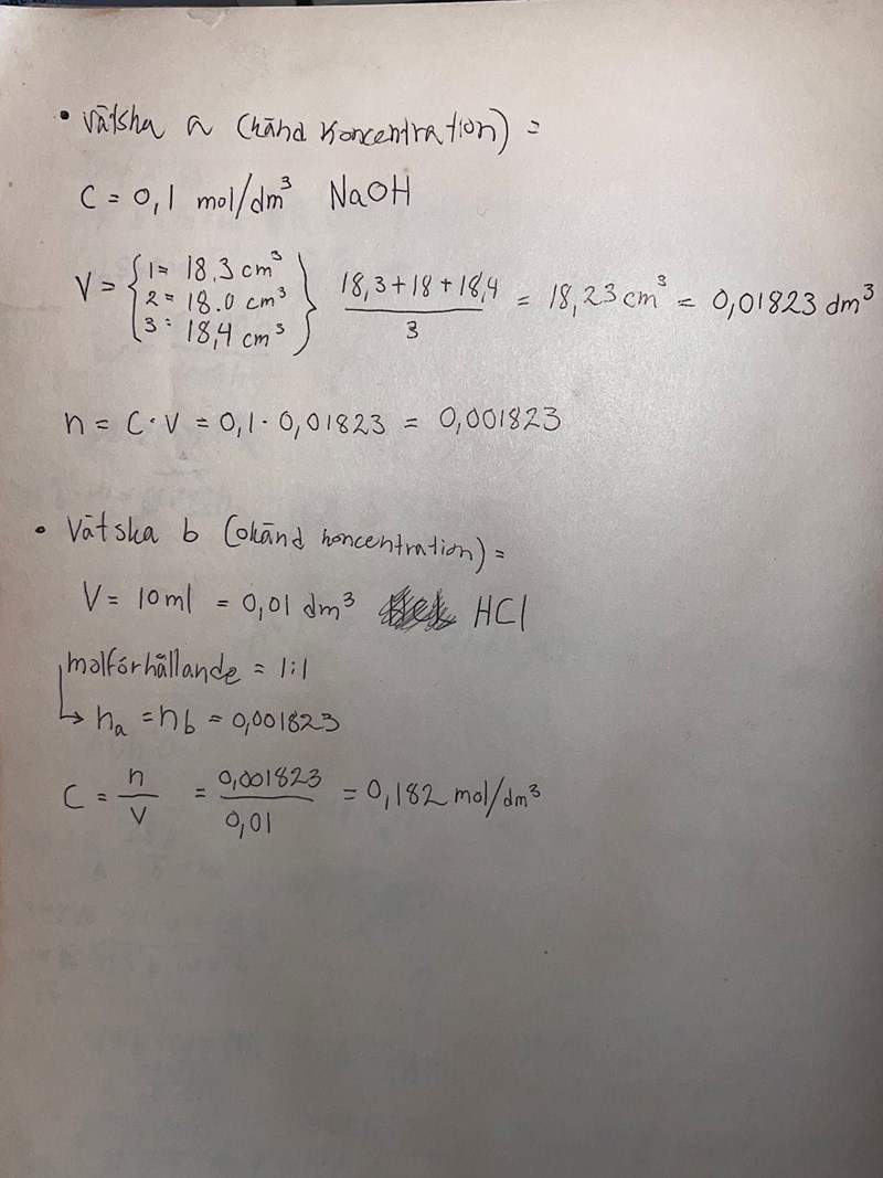 Piptreringen (utförd av lärare) fick 3 olika resultat, 18,3, 18 och 18,4. För att få fram endast ett resultat adderade ja och dividerade allt. jag har konverterat alla värden till kubikdecimeter istället för centimeter, fattar verkligen inte vad som gått snett. Provade att skriva in 0.180, 0.181 och 0.183 men allt var fel enligt formuläret.